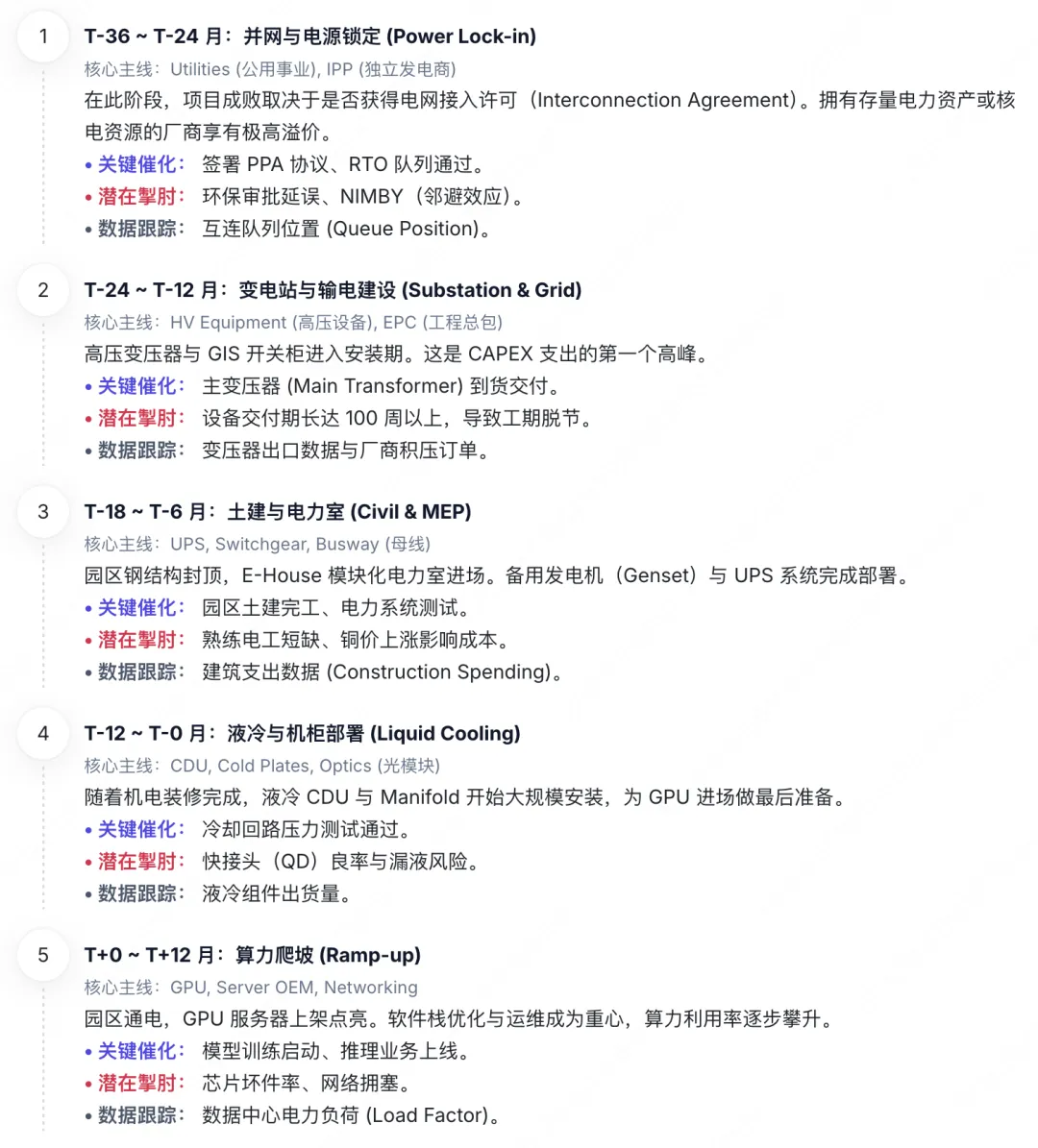 1 GW 级数据中心的建设是一个跨越 3-4 年的长周期接力赛。投资者应根据项目推进的物理节点,在不同阶段布局受益最显著的产业链环节。
