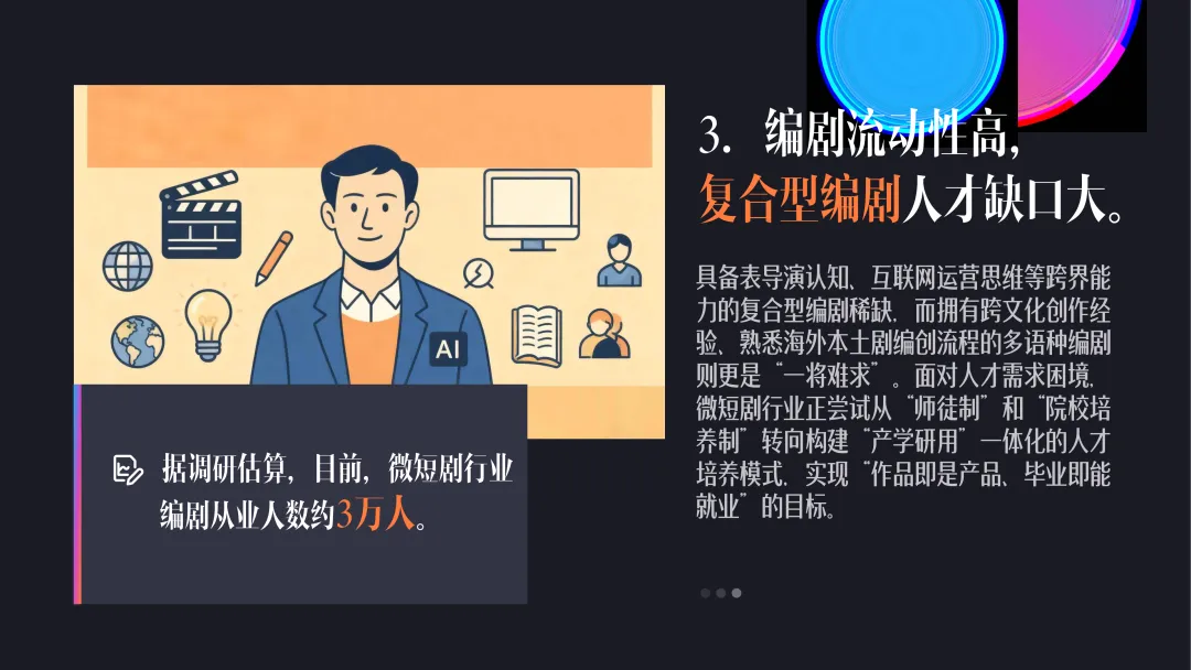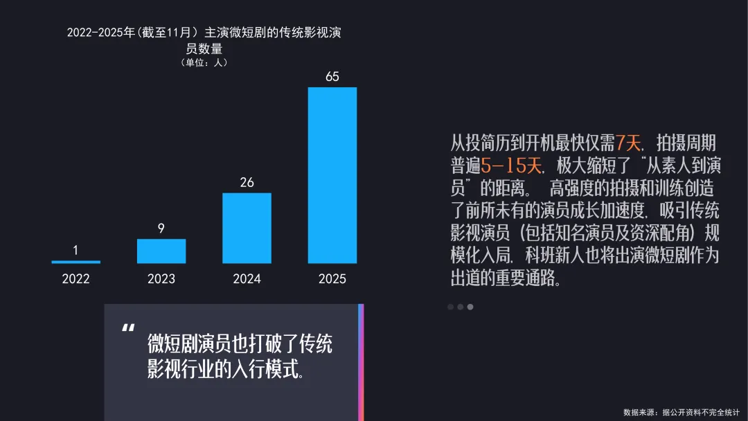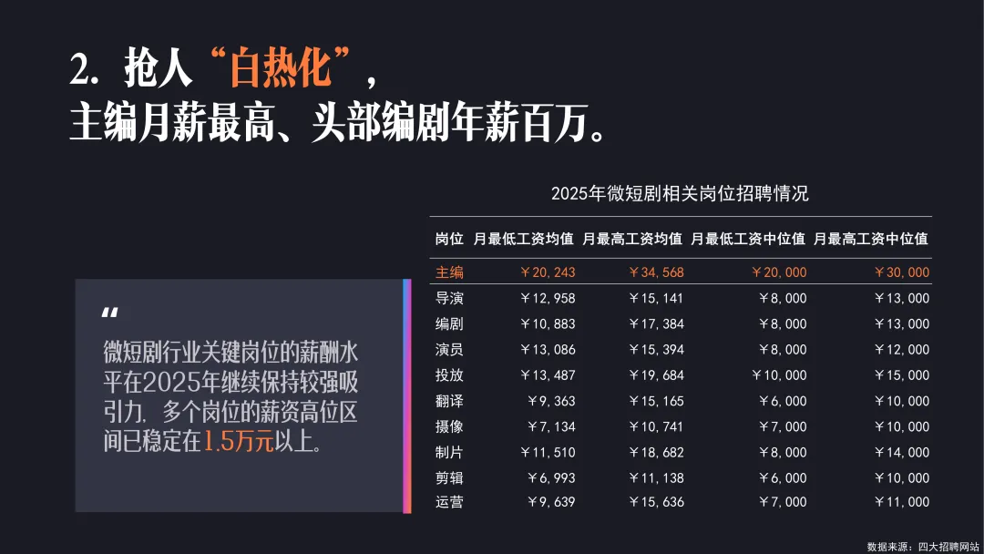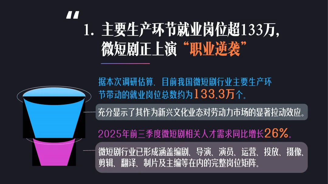 导读:微短剧已从 “小众内容” 升级为 “现象级产业”,带动主要生产环节就业岗位超 133 万个,2025 年前三季度相关人才需求同比增长 26%,形成完整岗位矩阵。剧组规模较 2023 年增长 3-4 倍,70%-80% 传统影视剧工作者涉足该领域,工业化进程提速。编剧成为行业核心资源,需求占比位列第二,头部编剧年薪可达百万级,复合型与多语种编剧人才缺口显著。演员入行模式被颠覆,横店影视城参演人次实现跨越式增长,传统影视演员与科班新人纷纷入局。行业呈现全民共创特征,“边拍边创” 与 AI 技术应用降低创作门槛,动画微短剧快速崛起。内容质感持续升级,80% 微短剧迈入高清时代,IP 改编量激增 17 倍。运营体系不断创新,专业宣发与 “预约观看” 功能普及,品牌合作微短剧数量增长,内容与营销深度融合。微短剧已覆盖多元用户群体,成为兼具产业价值与文化内涵的新兴业态。