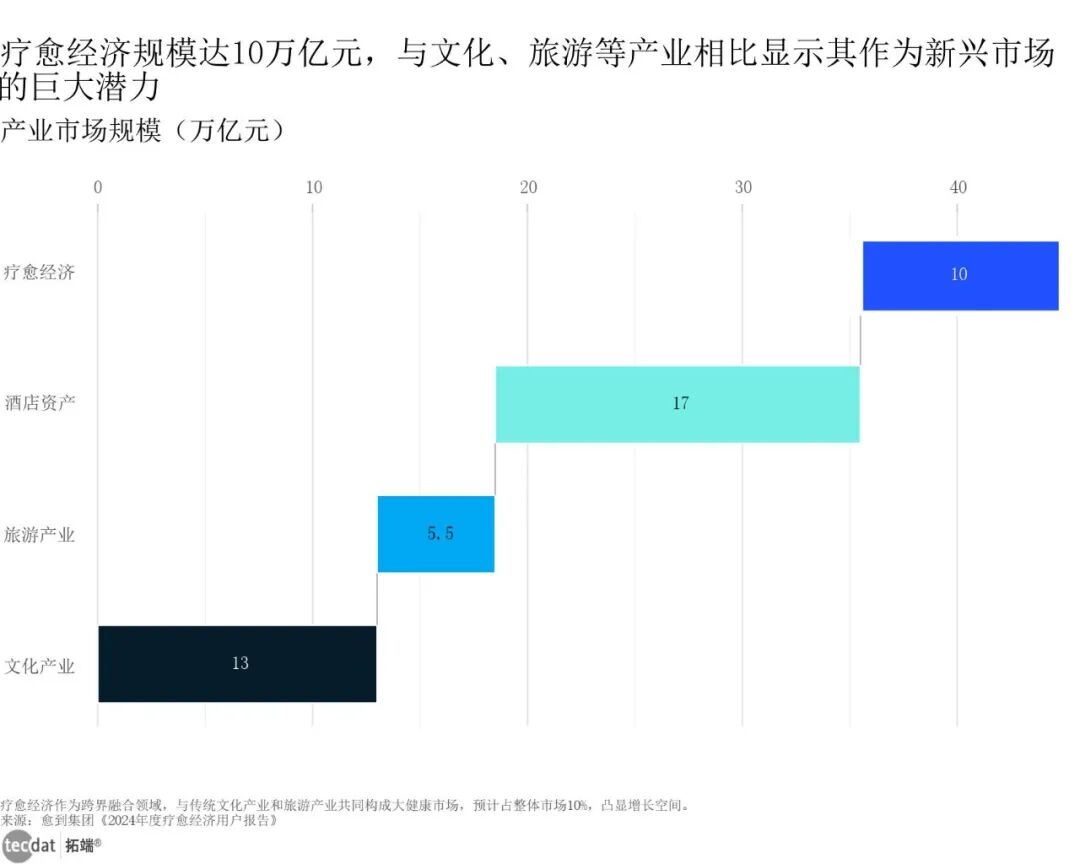 疗愈经济正以“跨界融合”的姿态加速扩张,渗透文化、旅游、酒店、健康服务等多个核心领域,成为大健康市场的新增长极。数据显示,中国疗愈经济市场规模已突破10万亿元,占相关产业总规模的10%,与13万亿元的文化产业、5.5万亿元的旅游产业形成互补,其增长潜力已不输核心消费赛道。