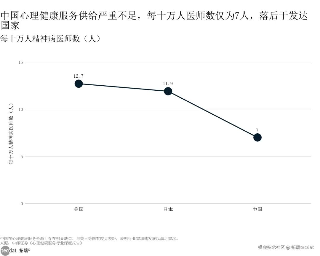 疗愈经济市场规模对比瀑布图表1数据EXCEL及图表PDF模板已分享到会员群3秒解读:跨界属性让疗愈经济打通多产业链路,规模比肩核心消费领域,增长空间广阔。对应人群行动建议:创业者可聚焦“文旅+疗愈”“健康+科技”等交叉赛道,挖掘细分机会;品牌方需加速产品迭代,实现“实用功能+情绪价值”双赋能。从消费结构来看,心理健康服务是最核心的增长引擎。预计2025年中国泛心理健康服务市场规模将达104.1亿元,2020-2025年复合增长率高达27%。但供给端的缺口同样显著:中国每十万人精神病医师数仅7人,远低于美国的12.7人和日本的11.9人,专业资源的稀缺性,正为行业创新提供了绝佳窗口期。