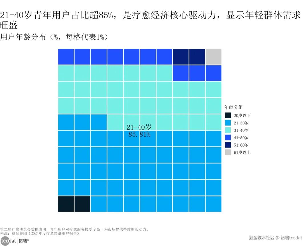 疗愈经济的消费主力画像清晰浮现:21-40岁的青年群体占比超85%,成为市场的核心驱动力。这一群体常年面临学业、职场、情感等多重压力,对能缓解焦虑、提升幸福感的疗愈服务接受度高,且消费意愿强烈,愿意为“情绪满足”支付溢价。