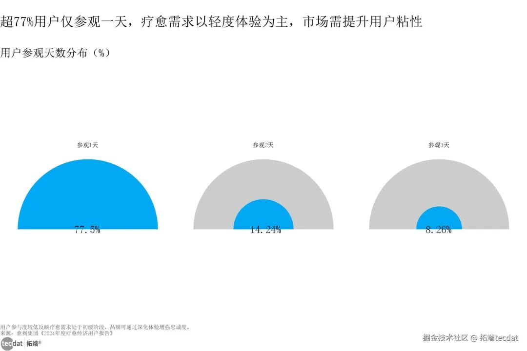 用户年龄分布华夫图表3数据EXCEL及图表PDF模板已分享到会员群3秒解读:青年群体是疗愈经济的“买单主力”,需求集中在情绪疏导与自我提升。对应人群行动建议:线下门店可推出青年专属“轻量化疗愈套餐”(如1小时冥想课、职场减压体验);线上平台可开发碎片化服务(如通勤时段情绪疏导音频、睡前助眠引导)。性别与地域特征同样鲜明:女性对疗愈的偏好尤为突出,两届疗愈博览会女性观众占比均超78%,第二届更是提升至81.36%;一线城市用户接受度更高,“北上广深”及沿海发达地区成为消费热点,这些地区的用户压力更大、付费意愿更强。从消费行为来看,疗愈消费正从“单次尝鲜”向“长期习惯”过渡。超77%的观众在疗愈博览会上仅参观1天,但参观2天、3天的用户占比持续上涨,这意味着消费者对疗愈的需求已从好奇转向深度参与,用户粘性正在逐步增强。