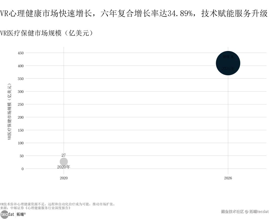 技术正重构疗愈服务的形态,AI与VR成为最核心的驱动力,让“高效、便捷、个性化”的疗愈体验成为可能。其中,VR技术的突破尤为亮眼:全球VR医疗保健市场规模预计从2020年的27亿美元增长至2026年的409.8亿美元,复合增长率达34.89%,其私密性、灵活性与沉浸感优势,完美弥补了专业资源不足的缺口,让远程治疗和自动化治疗成为现实。