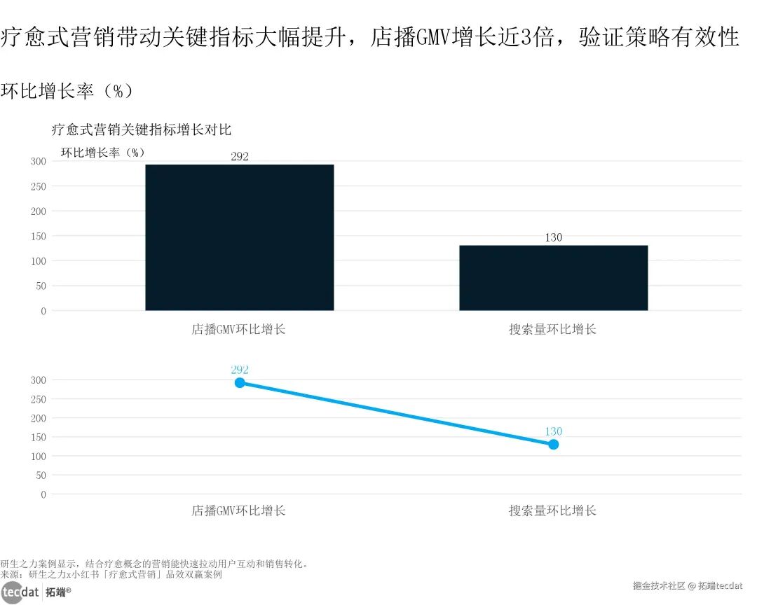 在疗愈经济赛道,“情绪共鸣”成为营销破局的关键,疗愈式营销已成为品牌增长的新引擎。研生之力与小红书的合作案例极具代表性:通过明星背书(伊能静“女性心灵导师”人设)、情绪共鸣内容创作(“把自己重新养一遍”)、店播场景优化,品牌核心产品“巢天娇”的搜索量环比增长130%,店播GMV环比增长292%,成功破解小众成分的信任难题。