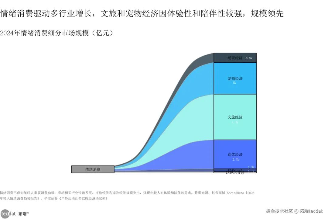 情绪消费已形成多元化细分赛道,不同品类凭借独特价值满足用户差异化需求。文旅经济、宠物经济、食饮经济等传统品类规模领先,而户外运动、IP趣玩食品等新兴品类增长势头迅猛,构成了完整的情绪消费生态。