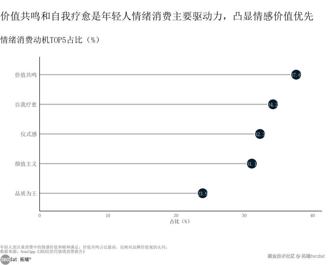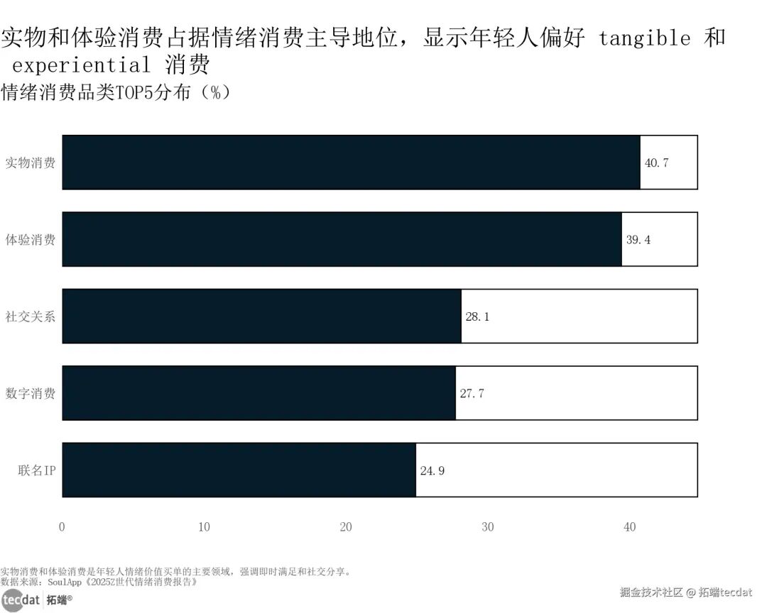 情绪消费动机刻度线图表8数据EXCEL及图表PDF模板已分享到会员群3秒解读:情感价值已超越物理属性,成为情绪消费决策的核心依据。对应人群行动建议:品牌需在价值观表达上与用户同频,通过故事营销、理念传递建立深度共鸣;产品设计中强化自我疗愈功能,如解压、舒缓等实用价值。消费品类分布上,实物消费(40.7%)和体验消费(39.4%)占据主导地位,社交关系、数字消费、联名IP紧随其后,反映出年轻人既注重即时满足的实物体验,也追求沉浸式的情感消费场景。
