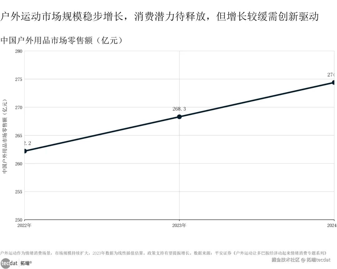 户外运动市场规模折线图表10数据EXCEL及图表PDF模板已分享到会员群3秒解读:户外运动市场基础扎实,但创新不足制约增长,情绪价值挖掘空间巨大。对应人群行动建议:户外品牌可结合疗愈概念,开发轻量化、解压型产品;线下机构可设计“运动+冥想”“徒步+心理疏导”等创新场景。