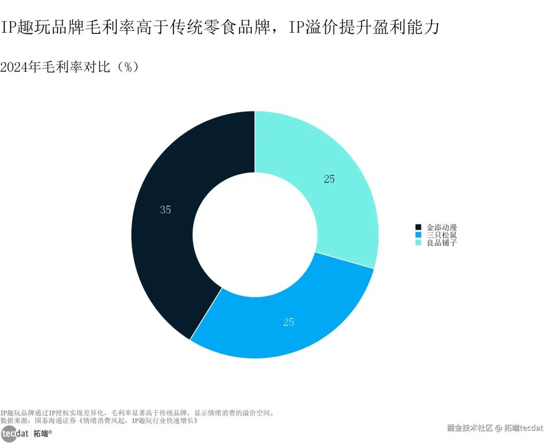 IP趣玩食品市场规模百分比堆叠面积图表11数据EXCEL及图表PDF模板已分享到会员群3秒解读:IP赋能让食品超越食用功能,成为情绪载体,溢价空间显著。对应人群行动建议:食品品牌可选择圈层热门IP合作,设计限量款收藏赠品;电商平台可打造IP趣玩专区,强化社交分享属性。毛利率表现上,IP趣玩品牌优势明显。金添动漫毛利率达35%,高于三只松鼠、良品铺子等传统零食品牌,印证了IP情绪价值对盈利能力的提升作用,也反映出消费者愿意为情感认同支付溢价。