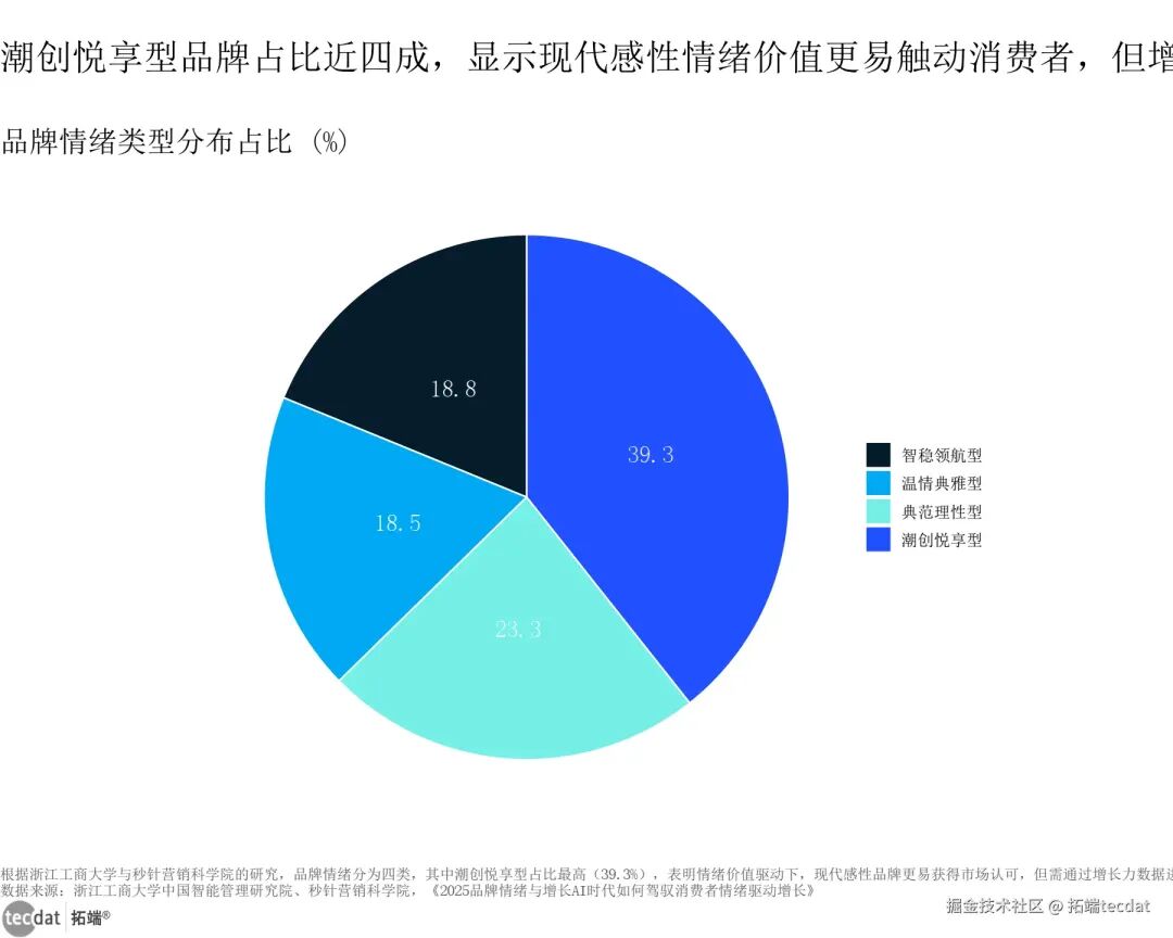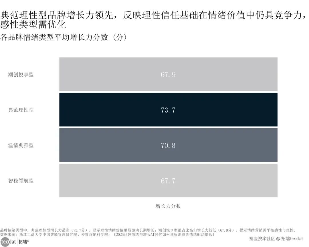 品牌情绪类型分布弦图表13数据EXCEL及图表PDF模板已分享到会员群3秒解读:感性情绪品牌更易吸引流量,但理性情绪品牌仍具稳定市场份额。对应人群行动建议:品牌需明确情绪定位,避免泛化;可根据目标客群特征,选择适配的情绪类型,如青年群体适配潮创悦享型,高端客群适配温情典雅型。从增长力来看,典范理性型品牌以73.7分领跑,温情典雅型(70.8分)、潮创悦享型(67.9分)、智稳领航型(67.7分)紧随其后,表明理性情绪价值更易驱动长期增长,感性品牌需在情绪共鸣基础上强化理性支撑。