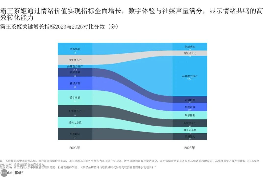 品牌情绪增长力热图表14数据EXCEL及图表PDF模板已分享到会员群3秒解读:情绪营销需“感性+理性”双轮驱动,单纯感性难以支撑长期增长。对应人群行动建议:感性定位品牌需补充产品功效、品质等理性支撑;理性定位品牌可通过情感化表达增强用户粘性。霸王茶姬的案例印证了情绪价值的商业转化能力。2023-2025年间,其外生增长力从70分升至92分,数字体验和社媒声量达满分,品牌潜力资产从18.6分爆发式增长至496.09分,通过国风情绪价值实现了品牌指标全面提升。