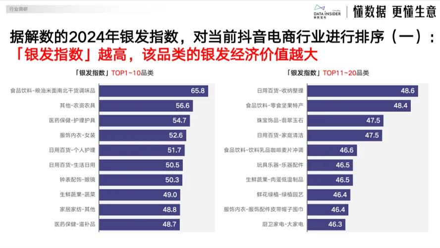 依据2024年银发指数排序,食品饮料(粮油米面/调味品)以65.8分位居榜首,紧随其后的是农资农具、医药保健(护理护具)及女装,显示出刚需品类极高的经济价值。