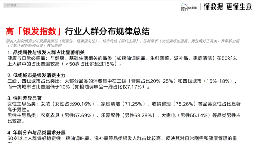 智能设备、家电及女装呈现出“低调但刚需”的反差特征,虽然银发人群占比仅8%左右,但凭借庞大的总销售额基数(如女装达5000亿)及较高的科技渗透增速,其市场体量不容忽视。