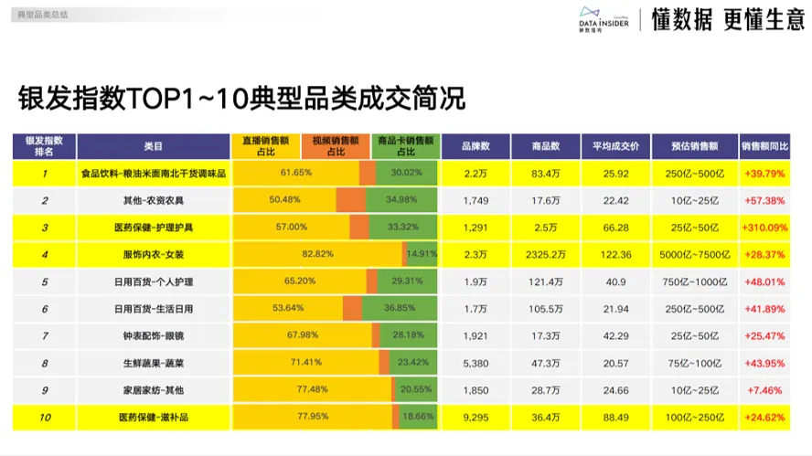 滋补品与护理护具属于典型的高潜力品类,银发人群占比分别达到16.65%和12.29%,且护理护具的销售额同比增速高达310.09%,市场爆发力强劲。