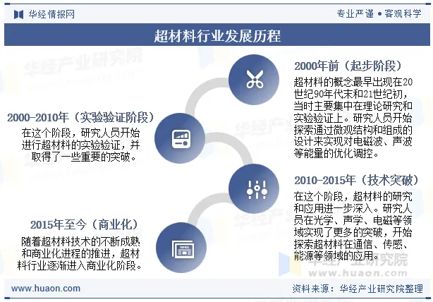 中国超材料行业发展历程经历了四个阶段,第一阶段为2000年前,此时为中国超材料行业起步阶段,研究人员开始探索通过微观结构和组成的设计来实现对电磁波、声波等能量的优化调控。2000-2010年为实验验证阶段,研究人员开始进行超材料的实验验证,并取得了一些重要的突破。2010-2015年在光学、声学、电磁等领域实现了更多的突破,开始探索超材料在通信、传感、能源等领域的应用。2015年至今,此时为商业化阶段,随着超材料技术的不断成熟和商业化进程的推进,超材料行业逐渐进入商业化阶段。
