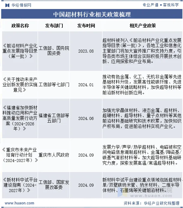 “十四五”以来,国家政府对超材料等新型前沿材料产业发展表现出了极高重视,首先是在“十四五”发展纲要中重点提出,要聚焦新一代信息技术、生物技术、新能源、新材料等战略性新兴产业,加快关键核心技术创新应用,增强要素保障能力,培育壮大产业发展新动能;2023年8月,工业和信息化部、国务院国资委又将超材料列入《前沿材料产业化重点发展指导目录(第一批)》,要求各地工业和信息化主管部门将加大宣传推广和支持力度,引导各类市场主体结合实际积极开展技术创新、应用探索和产业布局。
