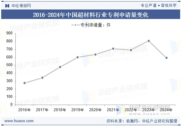 近些年中国超材料行业专利申请量呈现上涨态势,可以看出中国超材料行业正处于快速发展阶段,研发力度加大,其中超材料透镜是一类典型的颠覆性技术,打破传统透镜受到衍射极限的约束限制。超材料隐身斗篷技术已开始在军事装备中获得应用,超材料隐身技术得到了各国军工界的广泛重视。超材料的高效光捕获能力为太阳能电池的发展注入了新活力。数据显示,2024年中国超材料行业专利申请量为592件。