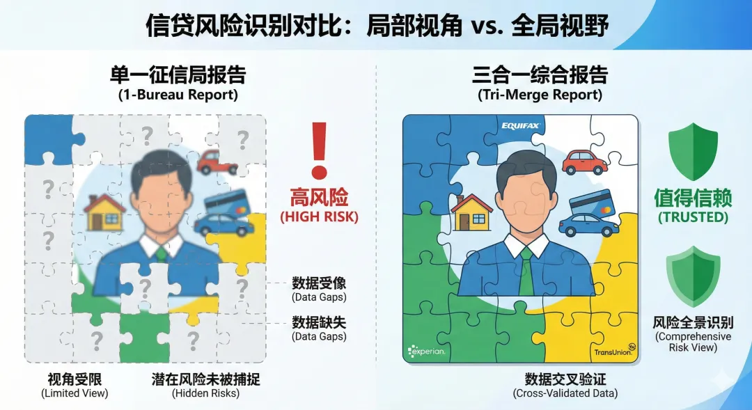 地域性差异:历史上,三大个人征信公司各有侧重。例如 Equifax 在美国东南部数据更全,TransUnion 则在中西部更强。对于全国性贷款,看单一报告极易漏掉关键的违约信息。