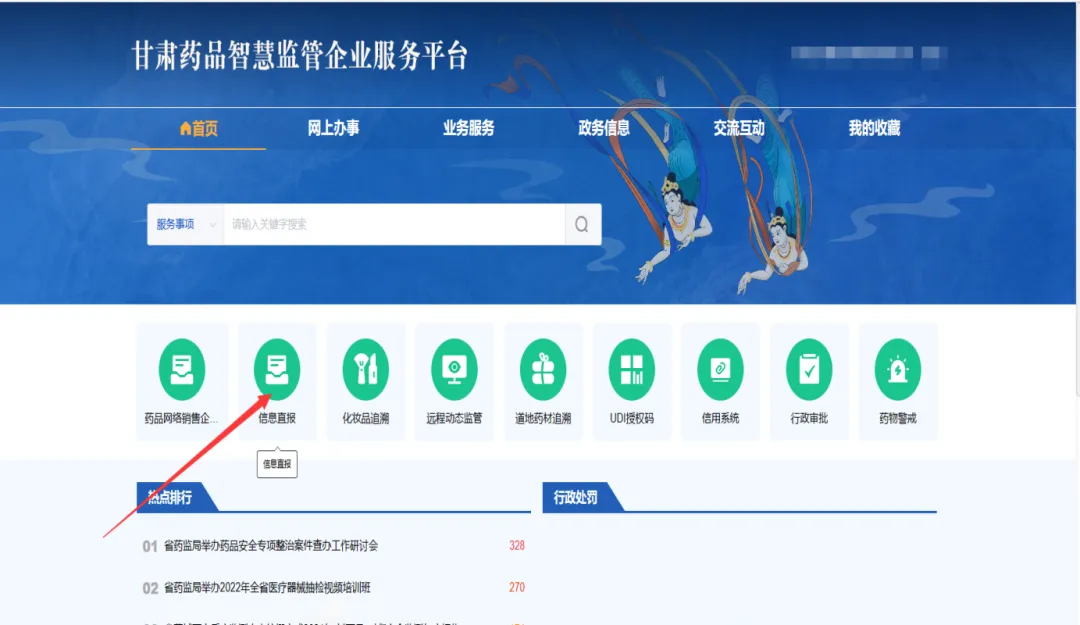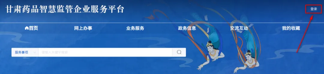 1. 打开网址https://bm.yjj.gansu.gov.cn:9000/qyzhmh/ web/index进入“甘肃药品智慧监管企业服务平台”,点击右上角“登录”,系统将跳转至“甘肃政务服务网”,可用企业或单位帐号进行登录,登录成功后自动返回至“甘肃药品智慧监管企业服务平台”。