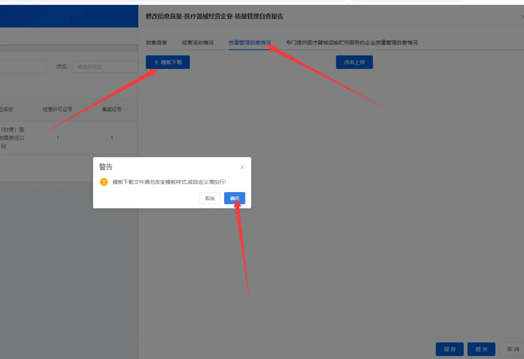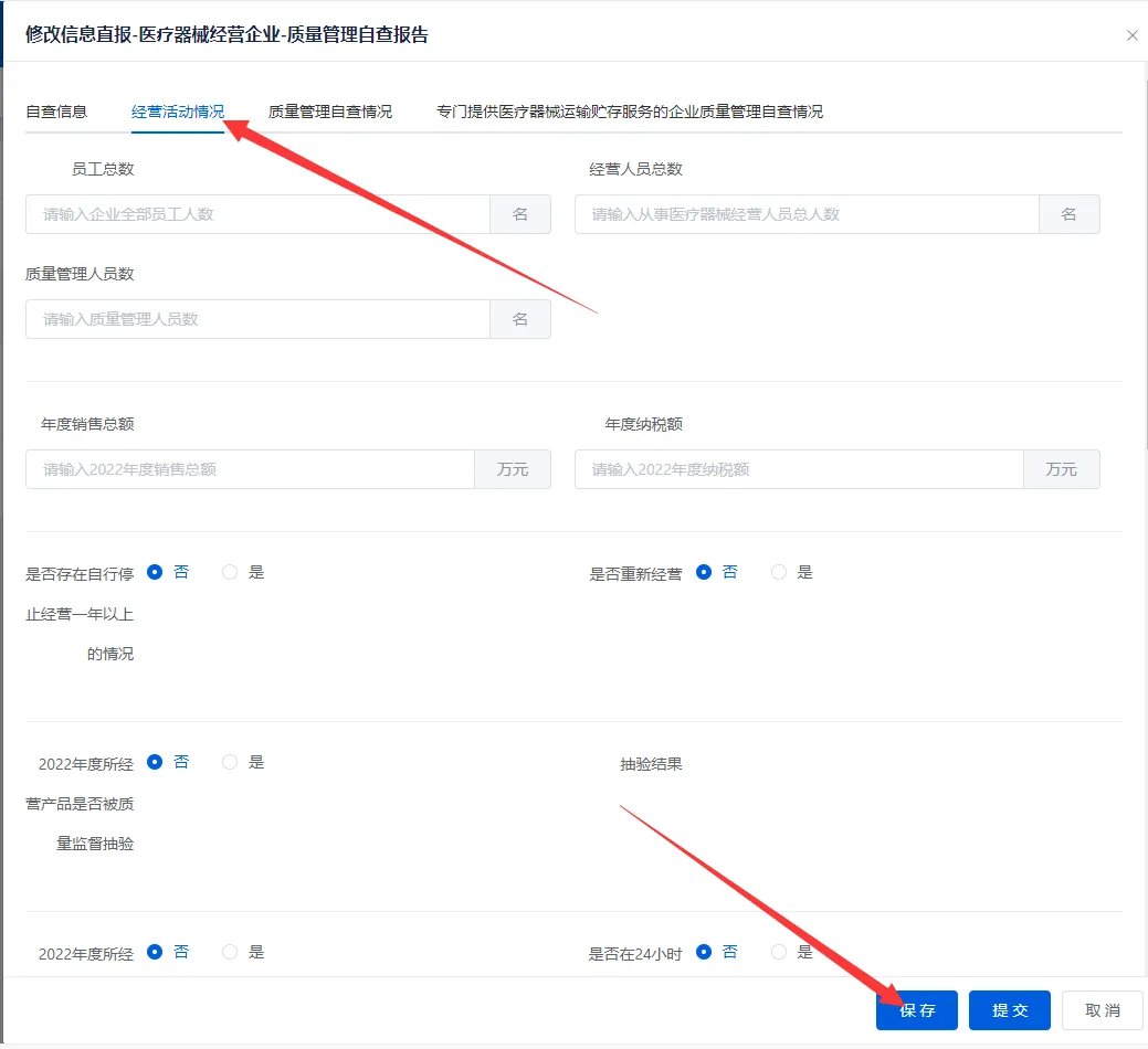 4.点击“修改”按钮。即可选择“经营活动情况”、“质量管理自查情况”等逐项填报。此外,专门提供医疗器械运输贮存服务的企业,须选择“专门提供医疗器械运输贮存服务的企业质量管理自查情况”。(注: