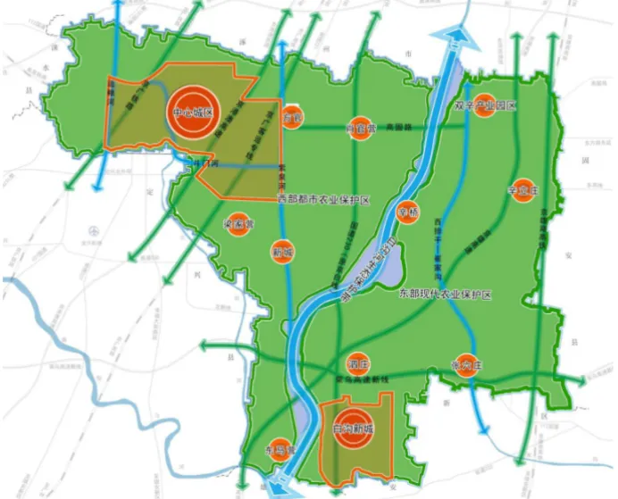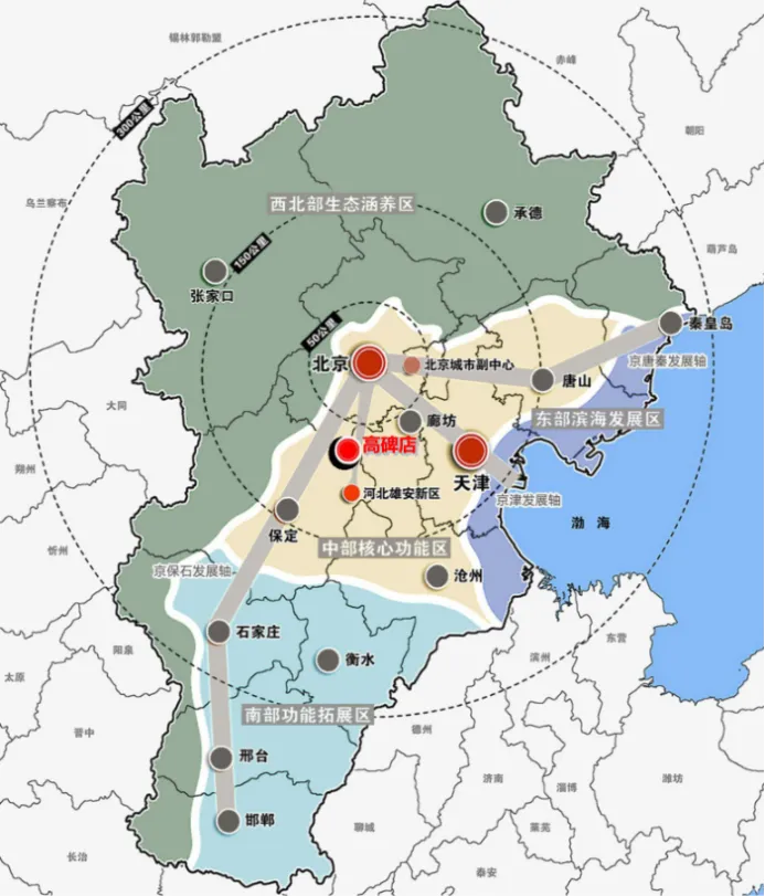 十四五以来,高碑店立足优势产业,深刻融入京津冀协同发展大局,充分发挥环京临雄、交通便捷的区域优势,积极承接北京、雄安产业链条,科学谋划统筹发展,打造京津冀世界级城市群中的品质生活之城。并立足自身发展基础,以中心城区和白沟新城为突破点,严格统筹全市开发保护,形成“两区多廊,双城多点”的城市发展格局,对中心城区进行强化集约高效发展,重点向东,向南,适度向北发展,以京港澳高速和京广高铁为界,优化功能布局,完善公共服务设施,提升中心城区生活品质。