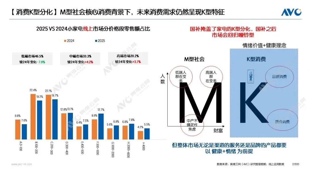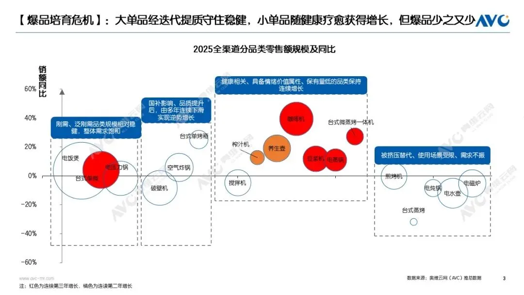厨房小家电行业正从追求规模扩张的增量时代,转向以价值增长为核心的“限量深耕”,奥维云网(AVC)全渠道推总数据显示,2025年厨房小家电整体零售额663亿,同比上涨3.8%,均价247元,同比上涨4.2%。未来的增长将依赖于对细分需求的精准挖掘和产品价值的实质突破。(厨房小家电包含品类:咖啡机、电饭煲、电磁炉、电压力锅、豆浆机、破壁机、搅拌机、榨汁机、电水壶、煎烤机、电蒸炖锅、养生壶、煎烤机、台式微蒸烤、空气炸锅)一是政策驱动升级,市场面临重构挑战。国补政策成为推动行业均价与销额提升的重要推手,在此背景下,各品牌纷纷加速新品迭代,推动产品结构升级,进而带动整体销额增长。奥维云网(AVC)线上监测数据显示,低端市场(300元以下)份额为46.5%,同比下滑7.8%;中端市场(300-1000元)份额为33.3%,同比上涨4.2%;高端市场(1000元以上)份额为20.2%,同比上涨3.7%。国补”政策虽拉动部分中高端需求、掩盖消费分级趋势,但政策效应减弱后市场将回归本质进入需求重构与深度调整期。二是渠道持续分化,新赛道凸显潜力。细分线上渠道中,抖音渠道持续扩张,据奥维云网(AVC)线上监测数据,2025年抖音渠道规模同比增长9%。与此同时,即时零售作为新兴线上渠道,成为行业新的增长机会点。厨房小家电具备体积小、易配送的优势,众多品牌纷纷布局。三是产品分化明显,创新决定品类竞争力。2025年厨房小家电产品表现呈现显著分化,具体可分为三类:第一类为刚需品类,如电饭煲、电压力锅等,依托稳定的日常使用需求,市场表现稳健,成为行业基本盘;第二类为健康疗愈类小单品,包括豆浆机、养生壶、咖啡机等,凭借精准匹配消费者健康养生需求及情绪价值诉求,实现逆势增长;第三类为场景受限品类,如电炖锅、电水壶、电磁炉等,受使用场景单一及其他厨小电品类挤压,市场表现不佳,需要通过技术创新、功能升级、人群精准匹配等突破发展瓶颈。四是人群深耕,从“大众市场”到“细分引擎”的战略转移。在市场告别普涨红利的背景下,行业机会聚焦于具体人群的细分需求里。品质银发、场景化消费年轻群体及养宠人群三类核心人群正成为驱动行业增长的新引擎。公开数据显示,我国银发经济规模已突破 7 万亿元,品质银发人群更青睐一键操作、易清洁的极简健康厨电产品,以此保障生活品质与使用安全。年轻群体带动西式厨电稳健增长,奥维云网(AVC)线上监测数据显示,2025年空气炸锅、台式单烤线上销售额分别达24.5亿元、8.4亿元,同比增幅8%、10%,制冰机市场需求亦同步攀升。公开数据显示,养宠市场规模达3100亿元,“拟人化”养宠趋势下,宠物鲜食制作、专属保鲜等细分场景需求未被充分满足,成为企业差异化竞争的关键。【材质健康化】在健康消费需求持续升温的背景下,优质材质家电产品需求保持稳定增长。奥维云网(AVC)线上监测数据显示,2025年钛内胆电饭煲、钢胆电压力锅、全玻璃养生壶的市场份额分别达到5.5%、42.9%和24.8%,同比涨幅依次为1.4%、3.9%和5.3%。【容积分化】“超小容量”产品市场短暂进入饱和状态,而蒸、炖、炸、烤类厨电则持续向大容量化发展。其中,电蒸锅14L及以上、电炖锅4L及以上、空气炸锅5.5L及以上、电烤箱37L及以上规格产品,同比销额均实现上涨。【烹饪高效化】唯有贴合消费者快节奏生活需求的产品,才能在市场中站稳脚跟。新品纷纷聚焦大功率、大火力、带压力、即冷即食等核心卖点;同时,便捷化升级成为亮点,大口径榨汁机、水龙头式养生壶及全自动咖啡机成为年度热门新品。【清洗便捷化】解放双手、清洗便捷的家电产品仍存在较大市场需求空间。奥维云网(AVC)线上监测数据显示,2025年全自动免手洗破壁机、可拆洗破壁机的市场份额分别为7.2%和15.8%,同比分别上涨1%和3.8%,未来增长潜力可观。【新一轮“换新潮”开启】奥维云网(AVC)线上监测数据显示,2021-2025年,厨小家电线上市场同比增速从19%下滑至-9.3%,行业即将进入5-6年的产品换新周期,这为厨小家电市场带来潜在增长红利。【AI搜索时代】内容入口重构消费决策逻辑。AI技术颠覆传统消费决策模式,用户从精准搜索单一产品(如空气炸锅),转向“减脂家电推荐”等泛需求提问以获取选购灵感;AI也从辅助工具升级为核心内容入口与决策起点,重塑行业流量分配规则。这场“人”驱动的变革,倒逼行业重塑底层逻辑。厂商需聚焦人群场景精准研发,布局即时零售与AI内容场;对消费者而言,厨房将更懂需求,概念营销退潮,唯有解决痛点、传递价值的产品方能立足,行业将迈入产品力比拼的高质量发展阶段。奥维云网原创内容,未经授权,禁止任何机构或个人抓取本文内容,用于训练AI大模型等用途。