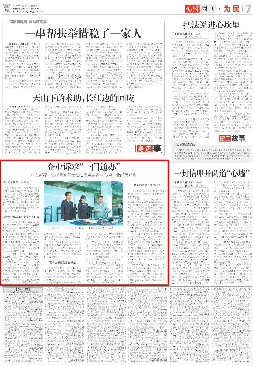 (本报通讯员 叶芊秀)地处粤东北的广东省河源市,是华南地区重要生态屏障,也是广东省推动生态优先、绿色发展的战略节点。随着粤港澳大湾区新兴产业加快崛起,这一发展态势对法治化营商环境提出了更高要求。近年来,河源市检察机关依托营商环境法治服务监督中心,以高质效检察履职破解企业发展难题、守护市场主体权益。