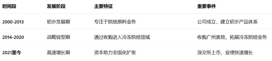 公司的发展历程可分为三个关键阶段:初步发展期(2000-2013年)、战略转型期(2014-2020年)和高速增长期(2021年至今)。在初步发展期,公司主要专注于烘焙食品原辅料业务;2014年,公司完成对广州奥昆的收购,开始涉足冷冻烘焙食品领域,这一战略性收购为公司后续高速增长奠定了坚实基础;2021年上市后,公司借助资本力量加速全国化布局,进入高速增长期。