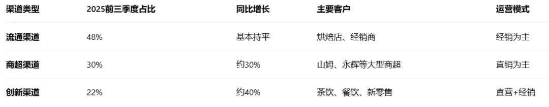 立高食品在渠道建设上采取了"多元化布局"的策略,覆盖了流通、商超、餐饮、茶饮及新零售等多种渠道。2025年前三季度,公司流通渠道收入占比约48%,同比基本持平;商超渠道收入占比约30%,同比增长约30%;餐饮、茶饮及新零售等创新渠道收入占比约22%,合计同比增速约40%。这种多元化的渠道结构既保证了业务的稳定性,又提供了多增长点。