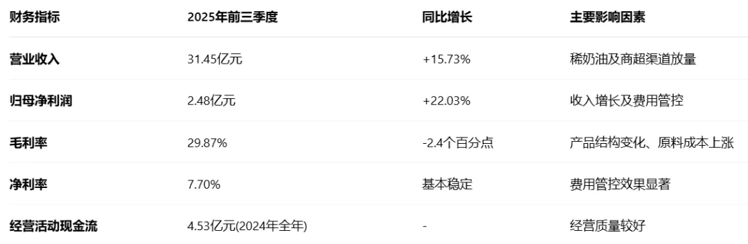 从产品结构看,2025年前三季度公司冷冻烘焙食品收入占比约55%,同比增长约10%;烘焙原料收入占比约45%,同比增长约24%。其中,稀奶油产品表现突出,营收同比增长约40%,酱料类产品营收增长超35%。这表明公司在保持冷冻烘焙基本盘的同时,高增长的原料业务正成为重要的增长引擎。