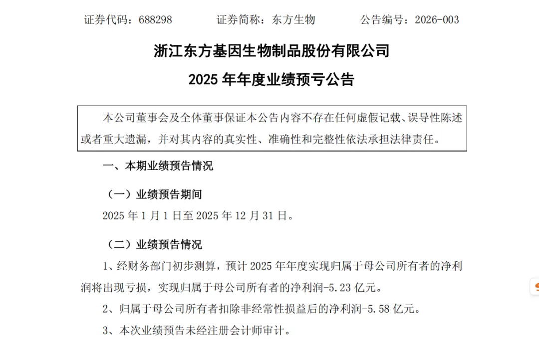 浙江东方基因生物制品股份有限公司(证券代码:688298,证券简称:东方生物)于2026年1月30日发布了《2025年年度业绩预亏公告》。公告显示,公司预计2025年度归属于母公司所有者的净利润将出现亏损,约为-5.23亿元,扣除非经常性损益后的净利润约为-5.58亿元。