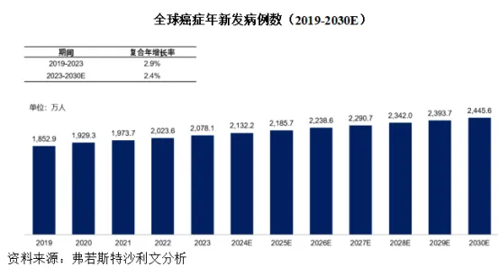 受生活方式变迁、环境恶化及社会压力增大等各种客观因素的影响,全球癌症年新增人数从2019年的1,852.9万人增加到2023年的2,078.1万人,复合年增长率为2.9%。预计2026年全球新发癌症人数将达到2,238.6万人,2030年达到约2,445.6万人。