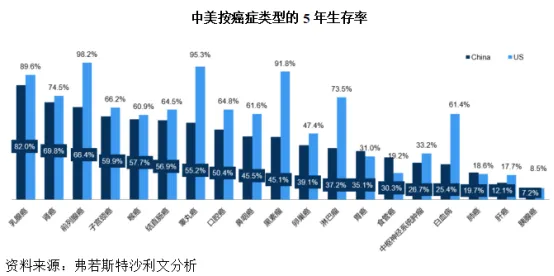 根据对中国和美国的调查数据,中国目前的5年生存率为40.5%,而美国则为67.7%。分癌种进行对比发现,在前列腺癌、睾丸癌、黑素瘤、淋巴癌和白血病几种癌症中,中国的5年存活率远低于美国。
