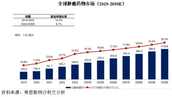 全球抗肿瘤药物市场蓬勃发展,更多的靶向药物及肿瘤免疫治疗药物问世和更多的适应症获批以及增加的患者人群,推动了抗肿瘤药物市场的进一步增长。从2019年到2023年,全球抗肿瘤药物市场规模从1,435亿美元增长至2,289亿美元,分别占全球药物市场的10.8%和15.5%,复合年增长率达到12.4%。市场规模的稳步增长与不断扩大的患病人群以及患者对创新疗法的支付能力上升有着密不可分的关系。预计全球抗肿瘤药市场在2030年达到4,198亿美元。