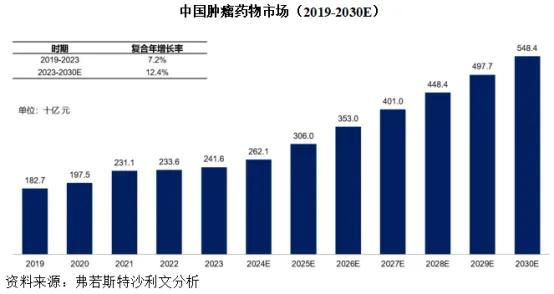 在中国药物市场当中,抗肿瘤药物市场销售近些年来一直呈现稳步增长趋势。市场规模在2023年达到2,416亿元,在过去5年当中的复合年增长率达到7.2%。癌症治疗方法的进展使得中国抗肿瘤药物市场未来几年也处于上升态势。预计中国抗肿瘤药物市场在2030年达到5,484亿元,年复合增长率为12.4%。