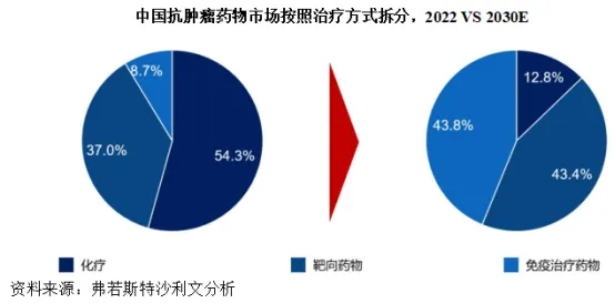 目前,中国的抗肿瘤药物市场以化疗药物为主导,占整体市场的54.3%,其他靶向药物包括小分子靶向药物,生物药等占37.0%,其余8.7%为免疫治疗药物。随着相关有利政策推动,新药上市及患者负担能力的提高,到2030年靶向治疗和免疫治疗将分别占据市场的43.4%和43.8%。