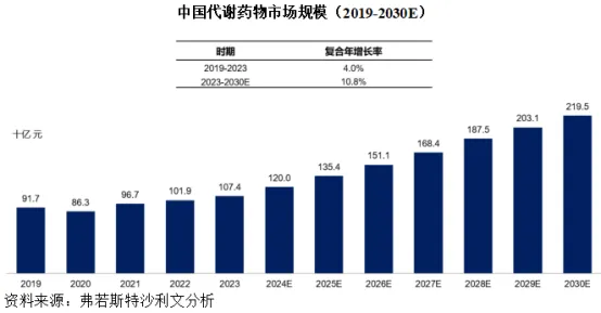 中国代谢药物市场销售近年来一直呈现平稳增长趋势,2023年市场规模达到1,074亿元,在过去5年的复合年增长率达到6.5%。药物研发的进展使得中国代谢药物市场未来几年也处于上升态势。预计中国代谢药物市场在2026年将会达到1,511亿元,到2030年达到2,195亿元。