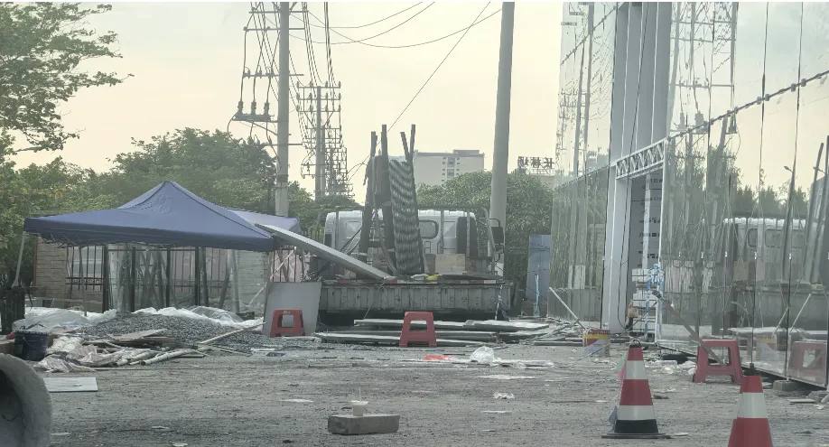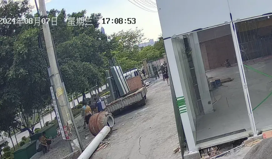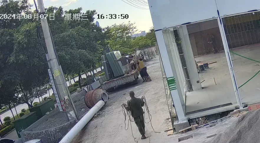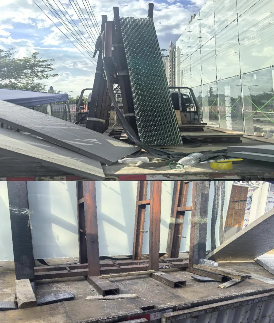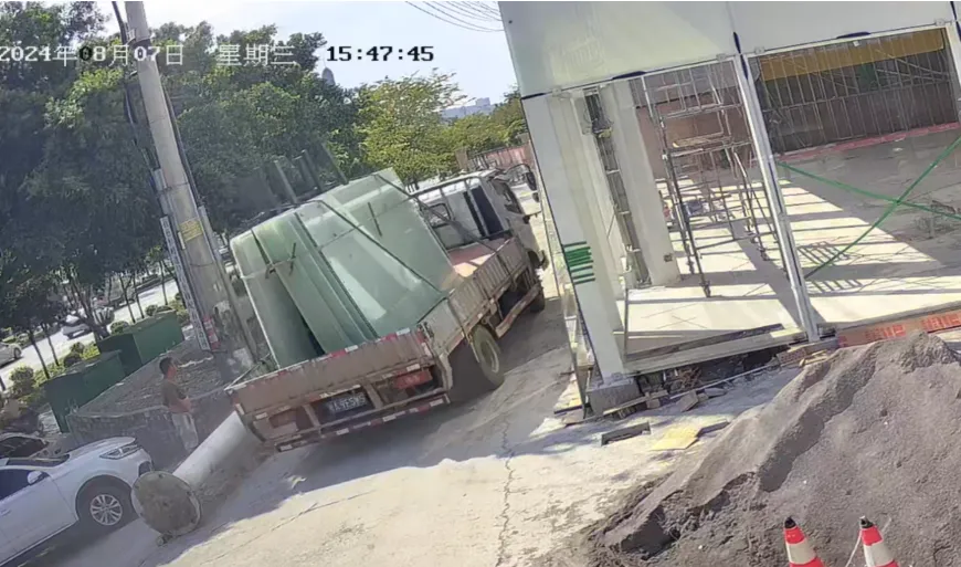 2024年8月7日16时许,张某驾驶载有40块涉事装修玻璃的福田轻型栏板货车(车牌号桂A9E5W5)到达装修施工工地旁的空地后,电话联系余*全收货,玻璃的装车方式为40片玻璃放置在A型铁架两侧,右侧32片,左侧8片(图1),40片玻璃总重量约为8494.4kg。余*全电话安排李*林找工人进行卸货。李*林找到杨*华、杨*思、杨*喜、杨*道、杨*奖、杨*志等6名工人进行卸货。8月7日16时33分,由李*林和杨再思2人在货车上将A型架右边的玻璃逐片倾斜放下货车,由杨*华、杨*喜、杨*道、杨*奖、杨*志在货车下接住玻璃后搬至旁边墙面靠墙摆放(图2)(图3),在卸下货车上A型架右边的19片玻璃后(图4),17时14分,李*林指挥司机将货车往前开约十米到达事故发生点。17时16分,李*林和杨再思2人在货车上将A型架左边的第一片玻璃放下货车,杨*华、杨*喜、杨*道、杨*奖、杨*志在货车下接住玻璃时,突然货车上A型架左边的7块玻璃同时倒向左侧,砸到正在接住第一片玻璃的杨*喜、杨*道、杨*奖、杨*志4名装卸工人身上(图5、图6),致4人死亡。
