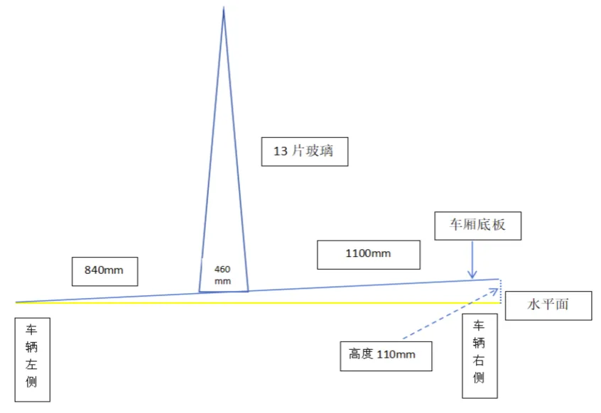 技术组使用专用设备对玻璃卸车时车辆停放区域的地面倾斜度进行了检测,车辆左侧地面比右侧地面低40mm,对车厢底板倾斜度进行了检测,车厢左侧比右侧低70mm(图9)。