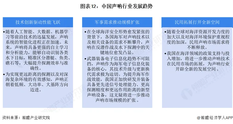中国声呐行业正迎来快速发展,呈现三大趋势。技术上,借助人工智能等前沿技术,声呐加速智能化,实现自主学习与精准探测,并向低频、大功率、大基阵方向发展,以满足远距离与深海探测需求;军事领域,全球海洋安全形势紧张,我国海军现代化建设持续推进,舰船建造列装带来大量声呐初次装配需求,“耗材”替换需求也逐步增加,电子信息化趋势下声呐技术升级迫切,推动市场规模扩张;民用方面,声呐在海洋资源勘探、水下工程建设、环境保护、渔业等领域应用前景广阔,随着海洋开发与保护重视程度加深,叠加政策支持,民用市场需求将不断释放,开辟全新发展空间。