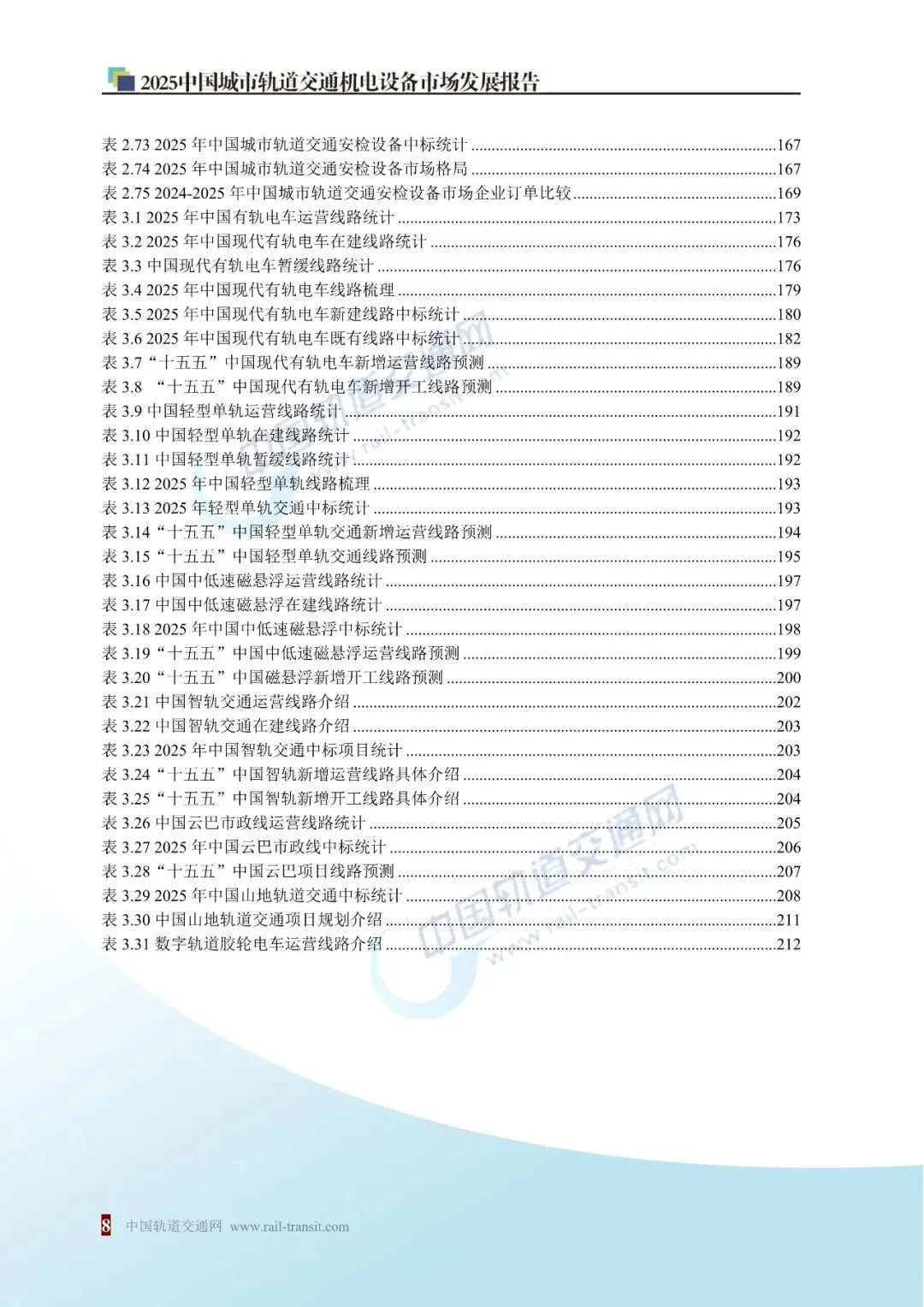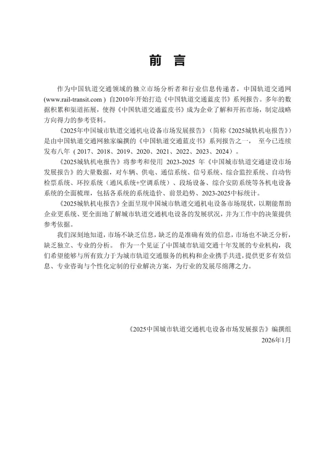 《2025年中国城市轨道交通机电设备市场发展报告》(简称《2025城轨机电报告》)是由中国轨道交通网独家编撰的《中国轨道交通蓝皮书》系列报告之一, 至今已连续发布八年 ( 2017、2018、2019、2020、2021、2022、2023、2024)。