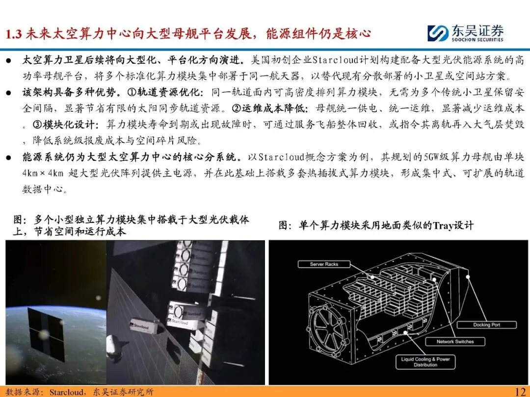 在全球AI大模型推动下,数据中心电力缺口日益凸显,催生将高算力卫星部署于低/中轨的“太空算力”新形态。相比传统地面数据中心,太空算力具备部署效率高、能源效率佳、冷却成本低等颠覆性优势。以“之江实验室+国星宇航”推出的“三体计算星座”为例,首批已入轨12星,远期规划1000POPS算力规模;海外SpaceX、谷歌、英伟达投资的初创企业Starcloud加速推进百GW级太空算力集群建设。