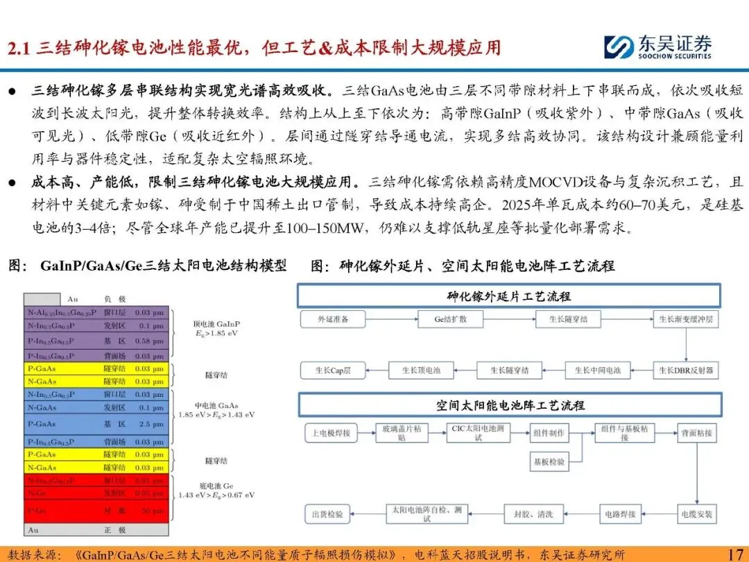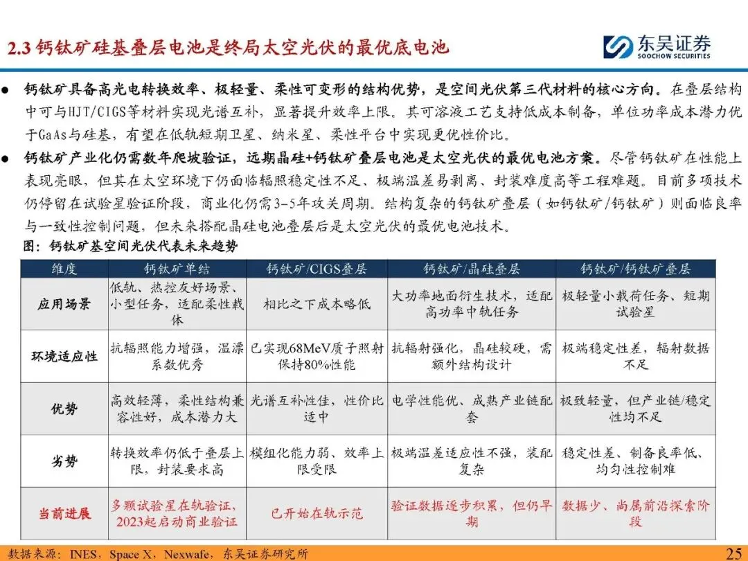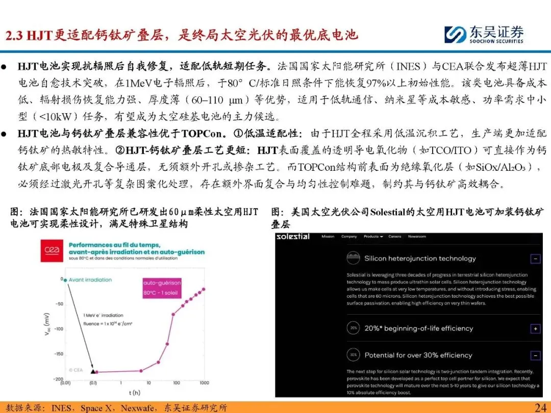 太空算力系统能源系统成本占比高达22%,决定卫星整体经济性。卷展式结构凭借轻量化、高功率质量比,逐步取代传统Z型结构,成为LEO轨道主流方案;但卷展式阵列仅适配柔性化、薄片化电池。硅基HJT电池凭借低温工艺、柔性兼容性和减重优势,最适配新一代卷展式光伏系统,海外NexWafe、Solestial等厂商已加速布局。同时,HJT亦为钙钛矿叠层的最优底电池,具备长期演进潜力。