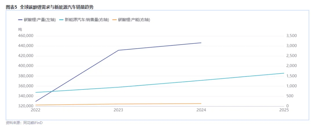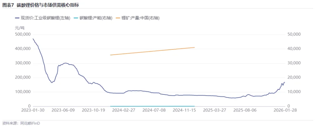 2023-2024年,锂矿与锂盐产能扩张周期错配,叠加价格低迷期企业资本开支收缩,导致2025-2026年供给增长受限。2025年锂矿端新增产能约20万吨,主要来自澳洲与非洲低成本矿山,但锂盐端产能释放节奏滞后,锂精矿库存持续维持低位,形成“原料紧张—加工瓶颈—价格传导”的链条效应。2026年锂矿端预计新增产能30-40万吨,但受制于加工端产能利用率超90%、锂云母矿原料短缺等因素,锂盐供给难以实现同步增长。此外,长协采购比例从50%提升至80%,导致现货市场流通量减少,加剧库存紧张与价格弹性放大。因此,锂矿端库存偏紧与锂盐端产能释放节奏不匹配,是推动2025-2026年碳酸锂价格中枢上移的核心供给因素。