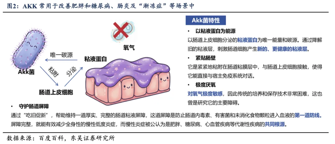 AKK 菌能在肠道粘液层中生长,靠降解肠道粘液生存,并通过竞争性排斥的方式保护肠道免受病原体的侵害,因此补充 AKK 菌或它的外膜蛋白 Amuc_1100 能减轻肠炎症状、预防肠炎导致的肠癌; 同时 AKK 菌与肥胖、糖尿病、心血管代谢疾病呈负相关,现常应用于改善肥胖和糖尿病、改善结肠炎预防肠癌、改善“渐冻症”症状等场景中。