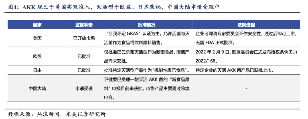 AKK 现已于美国实现准入,灭活型于欧盟、日本获批,中国大陆申请受理中。 AKK活菌及灭活菌均可作为食品饮料原料在美国市场销售, 企业聘请专家委员会评估安全性,通过后即可上市;欧盟(包括英国)及日本批准巴氏杀菌灭活型作为新型食品,活菌产品尚未获批。2025 年 11 月 14 日中国卫健委受理一款灭活 AKK 菌申报新食品原料,目前未获批,市售产品主要通过跨境电商形式销售。