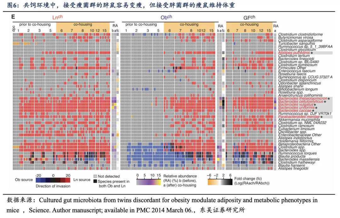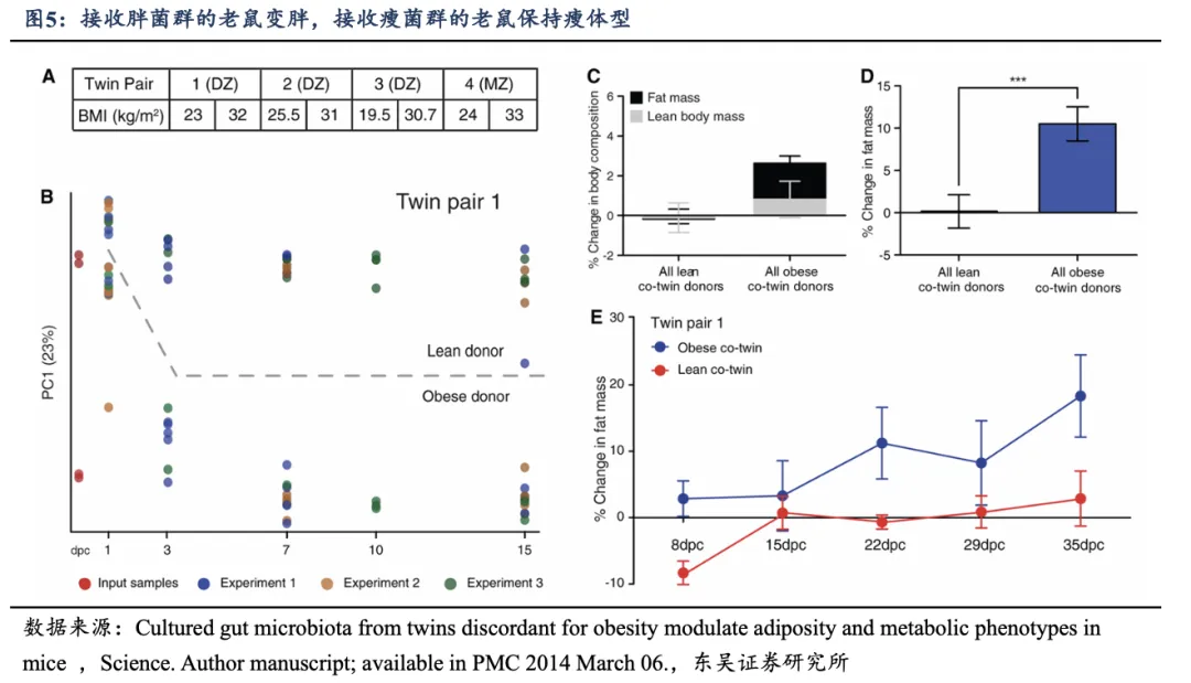 2013 年美国华盛顿大学 Jeffrey I. Gordon 教授课题组在《Science》杂志发表的研究表明, 将一对胖、瘦双胞胎的肠道菌群分别移植到无菌鼠体内, 在相同低脂高纤饮食条件下,接收“胖菌群”的老鼠变胖,接收“瘦菌群”的老鼠保持瘦体型。