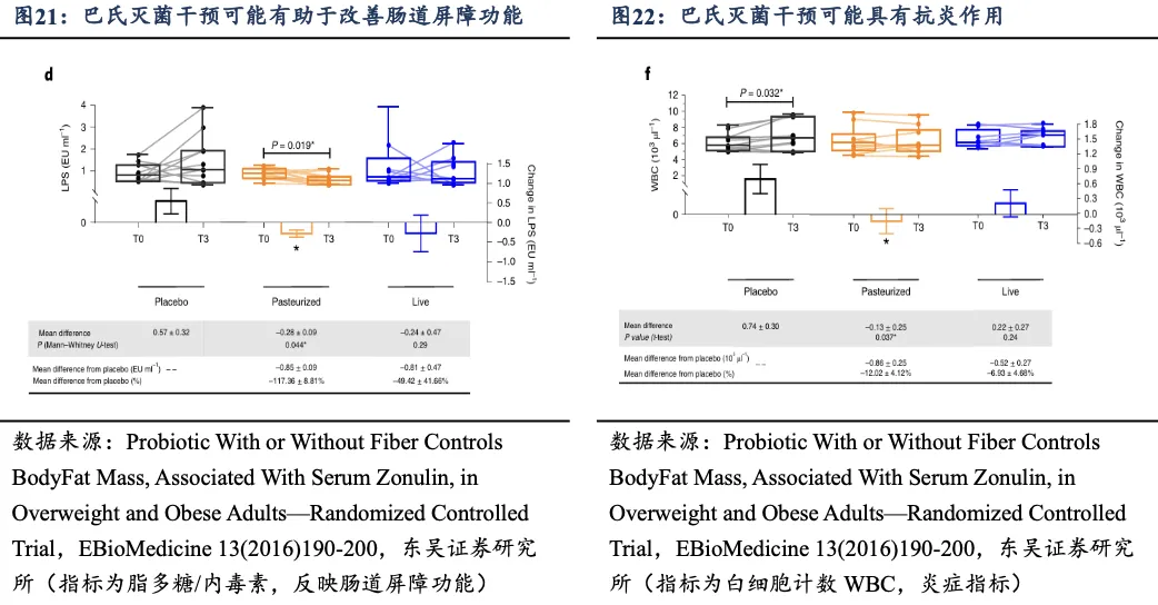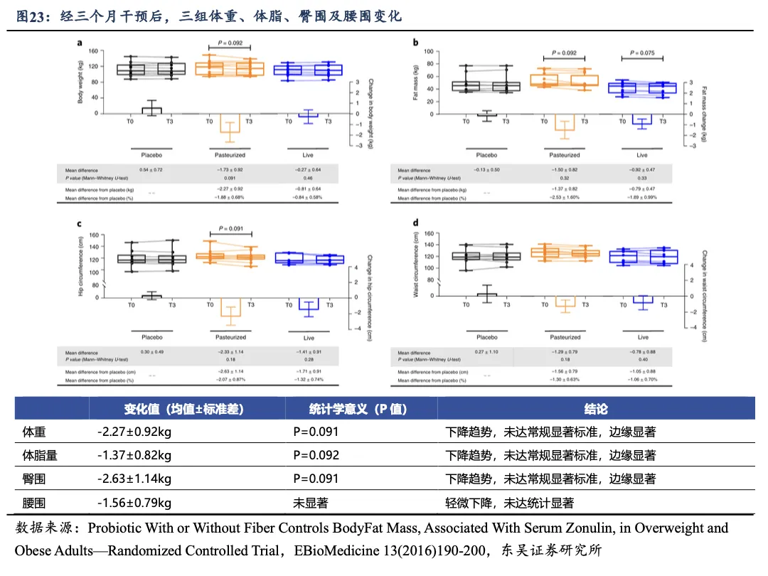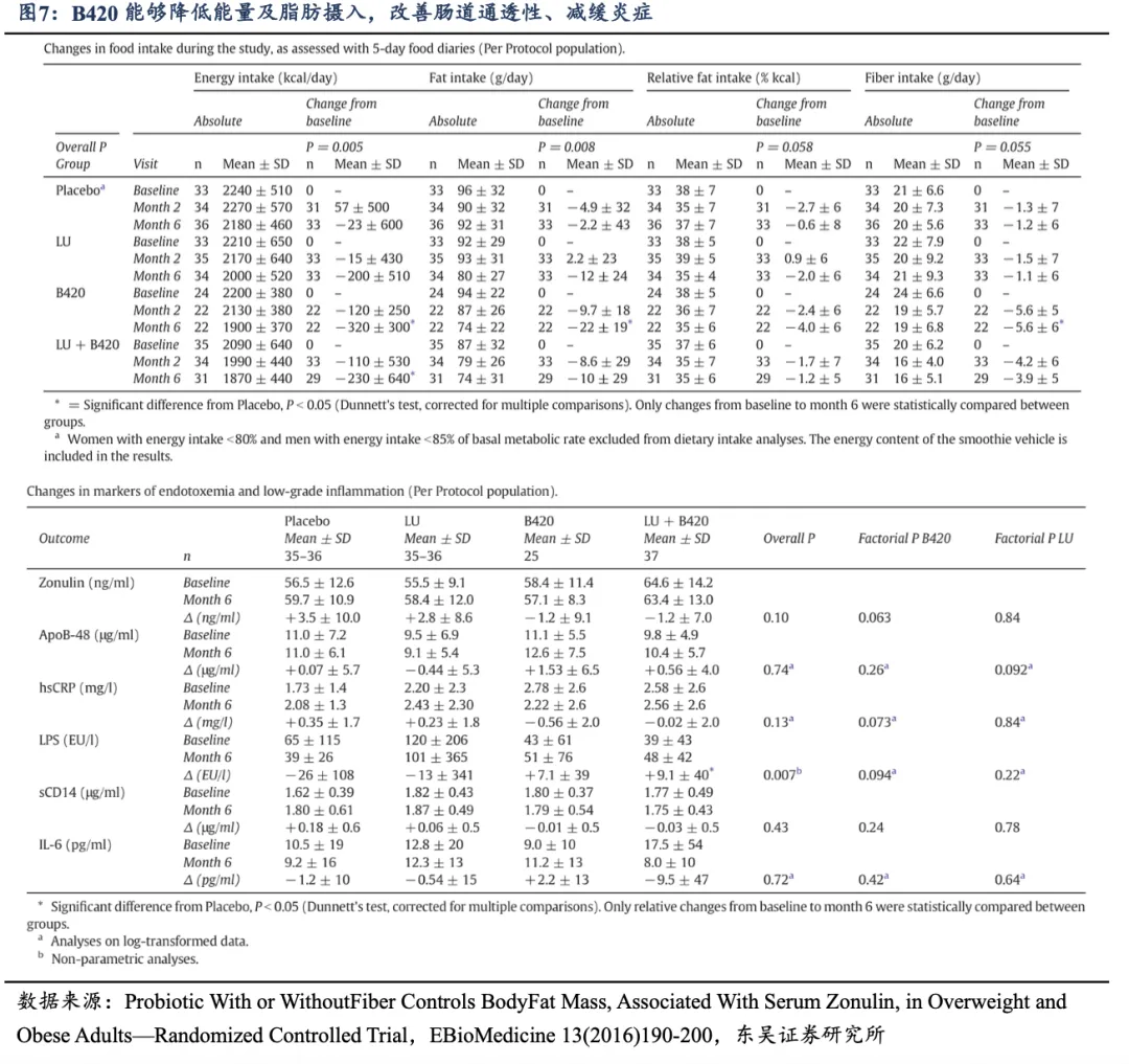 总结:B420 益生菌通过降低脂肪及能量摄入来降低体脂(提升瘦体重),与益生元配合使用效果更加,6 个月为期体脂均降 4.5%(组间差值约-1.4kg) ;同时能够改善肠道通透性(预防肠漏)、减缓炎症。