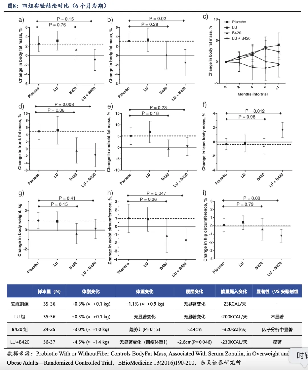 ③B420组相对体脂变化较安慰剂组降低-3%,未达显著;合生元组(LU+B420)相对体脂显著降低-4.5%(组间差值约-1.4kg,P=0.02),即B420+LU的组合对降低体脂的效果更为明显。