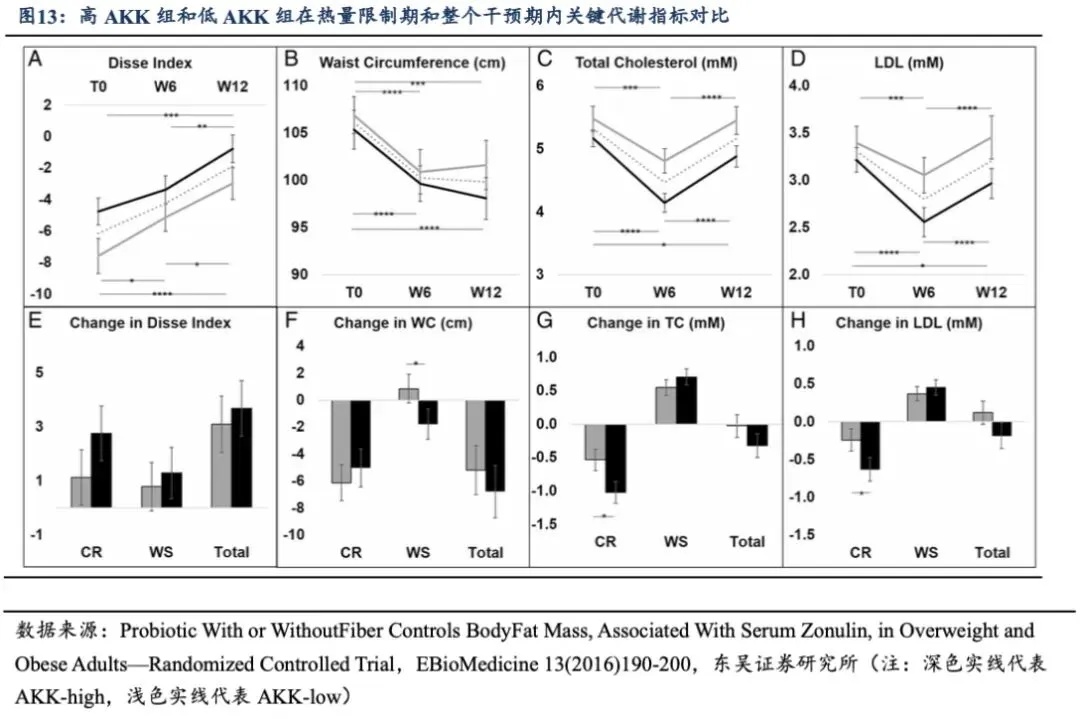 ②高 AKK 组在饮食干预中获得的代谢效益更多(即高 AKK 人群减肥效果更好,解释了为什么在相同的减肥方案下, 不同人的代谢改善程度不同), 血脂改善、 胰岛素敏感性改善更明显,即使在体重稳定期,高 AKK 组的腰围仍在持续减少。