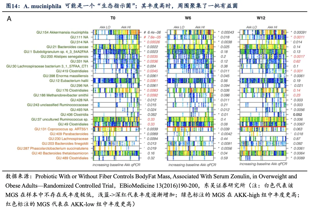 ③AKK 不是孤立存在,而是“有益菌联盟”的一部分。有 26 个其他 MGS 的丰度与 AKK 丰度显著相关。这表明 AKK 不是一个孤独的“明星菌”,而是生活在一个特定的微生物群落中。AKK 的有益效应在整体菌群多样性高的生态背景下被放大,因此健康的肠道环境是益生菌发挥最大作用的基石。